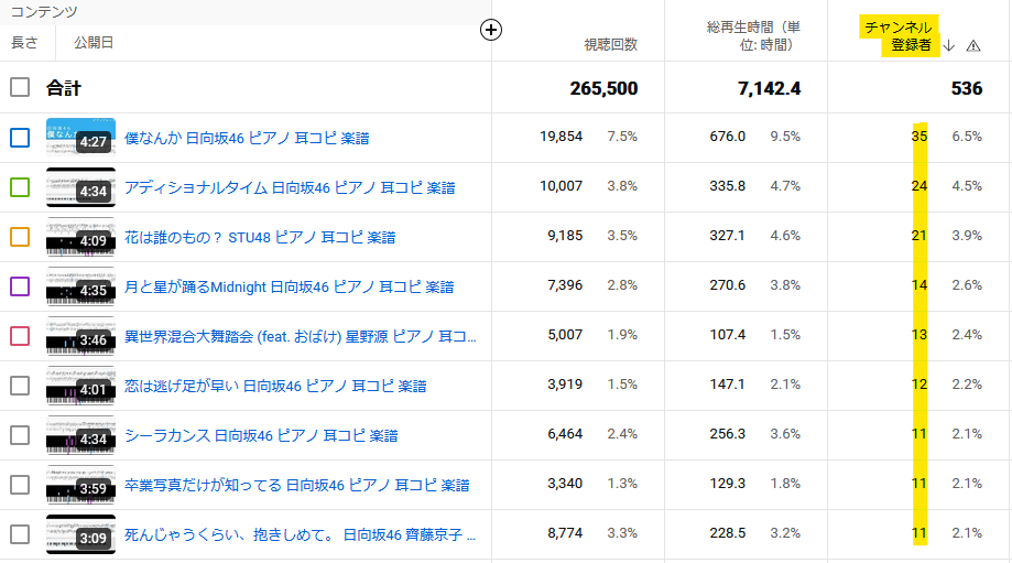 YouTube Studioでは、チャンネル登録のきっかけとなった動画を数値で確認することができます。